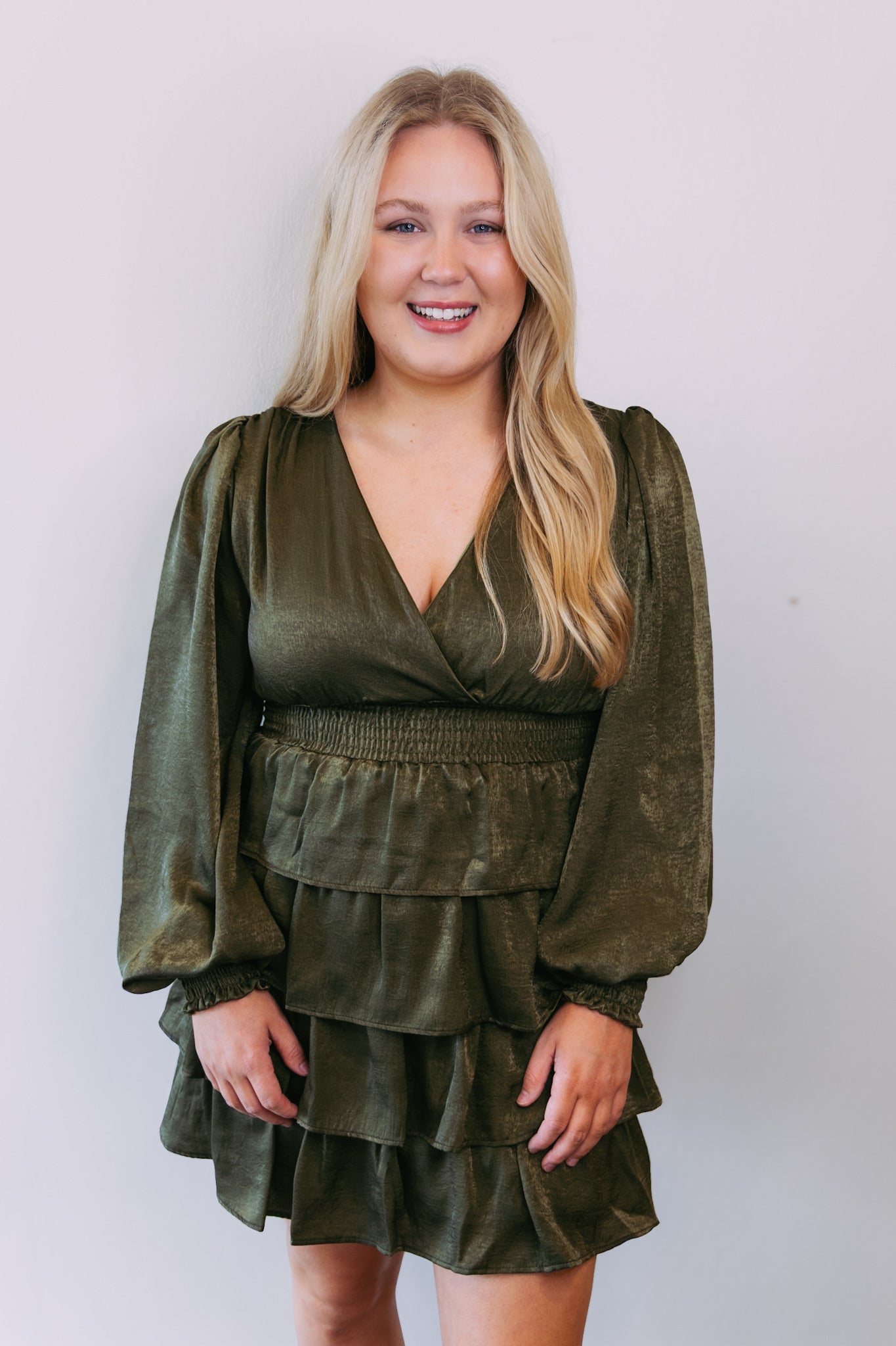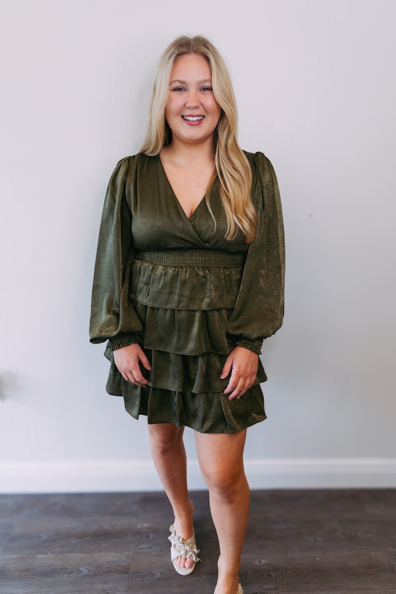 Olive Satin Tiered Dress