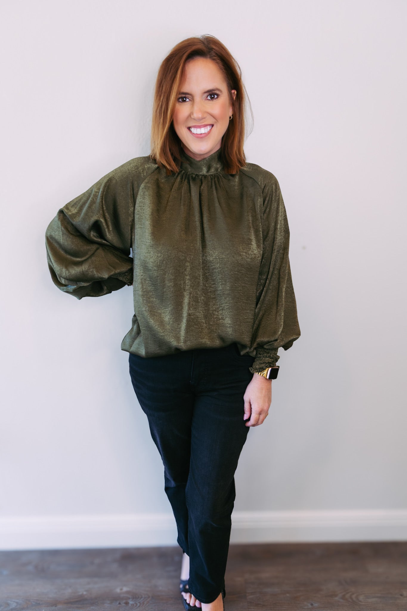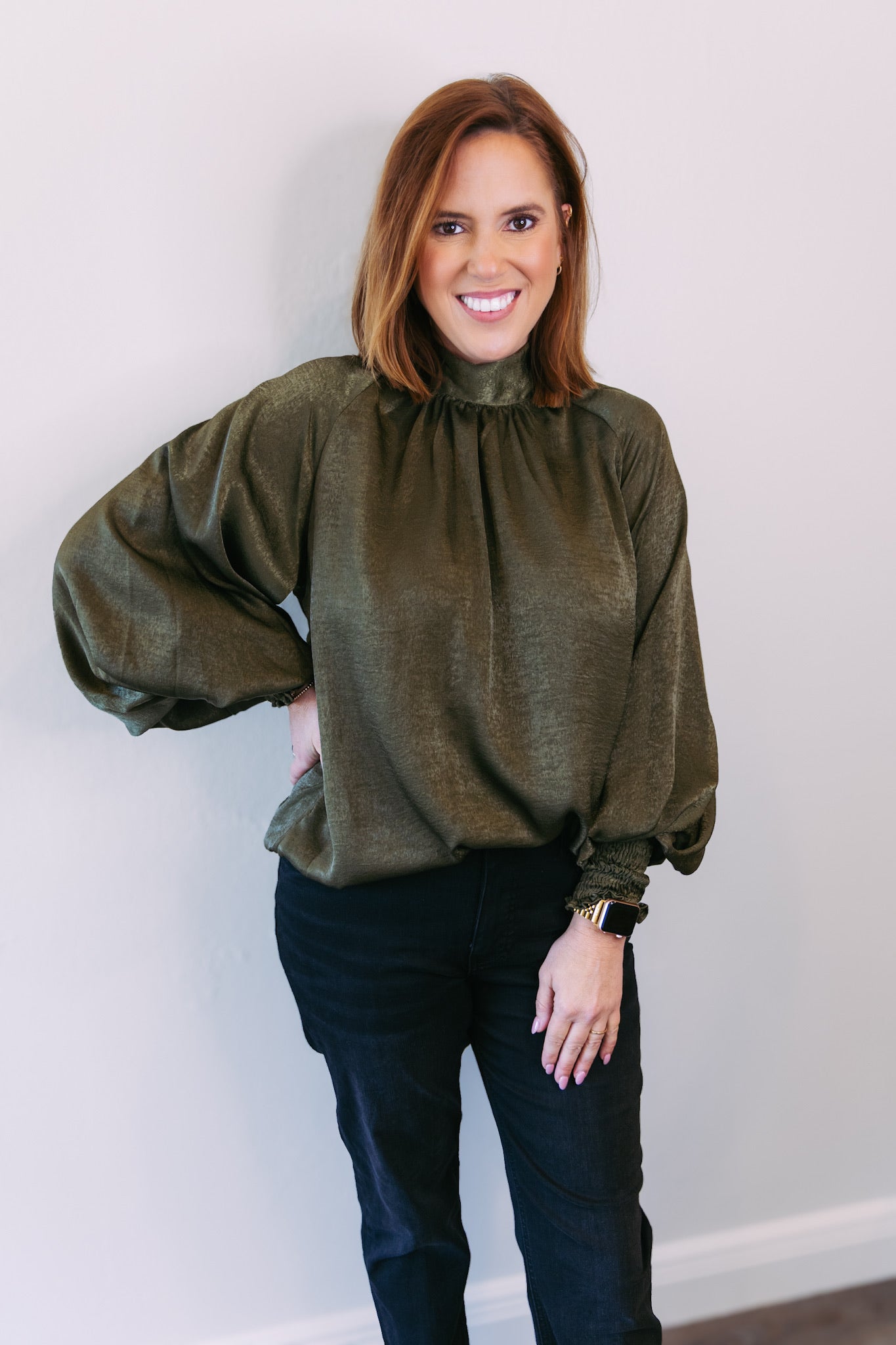 Olive Satin Long Sleeve Blouse
