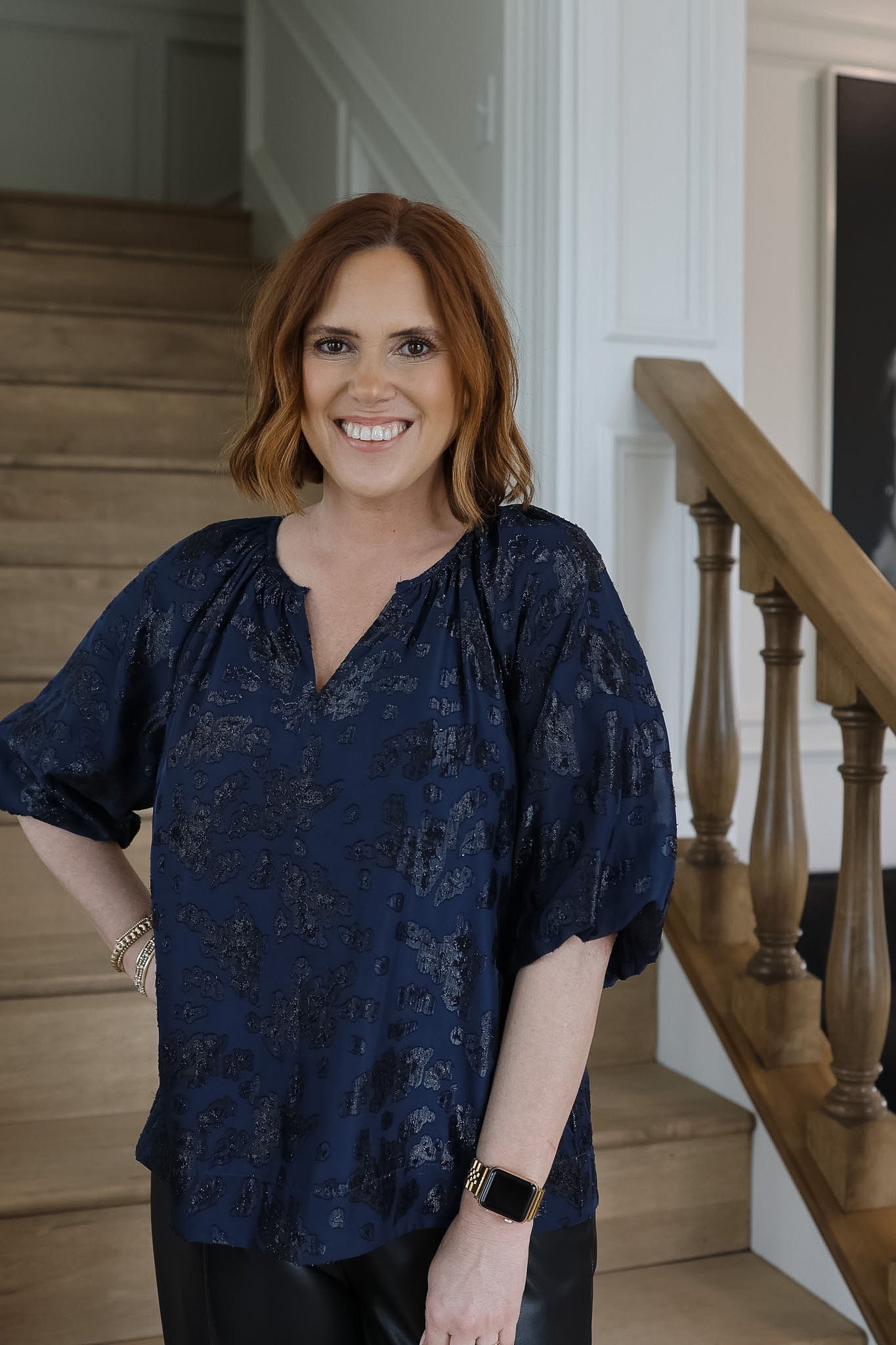 Navy Puff Sleeve Peasant Top