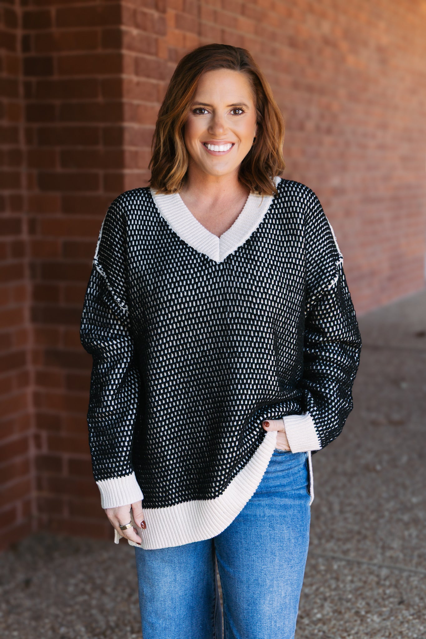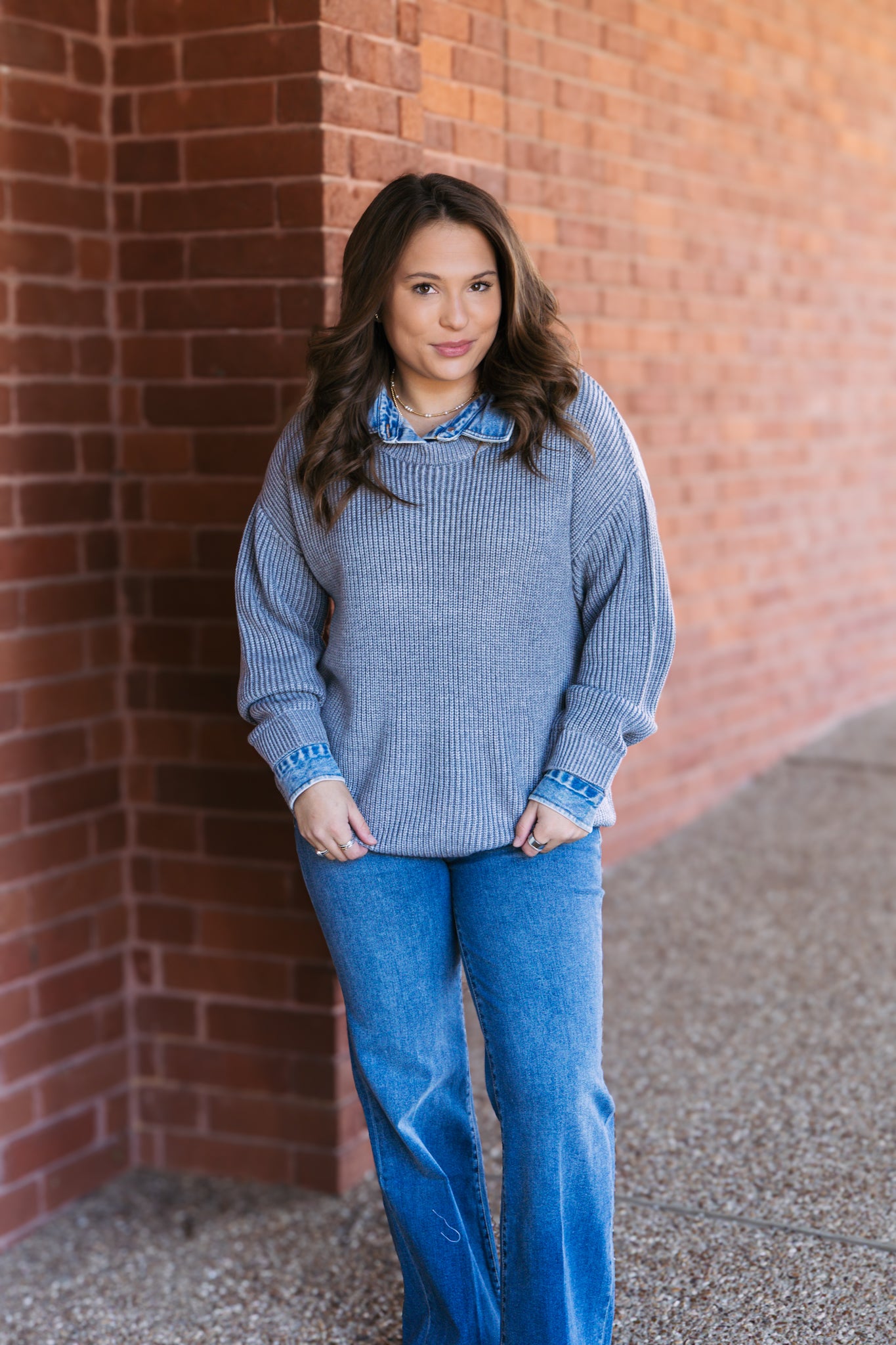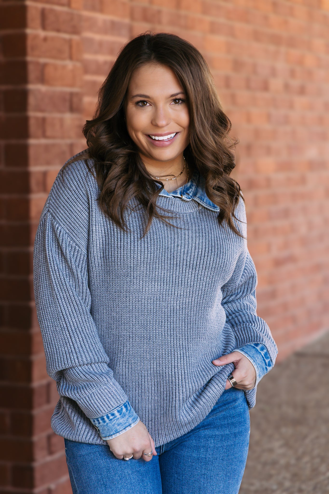 Washed Heather Grey Sweater W/ Denim Collar Cuff