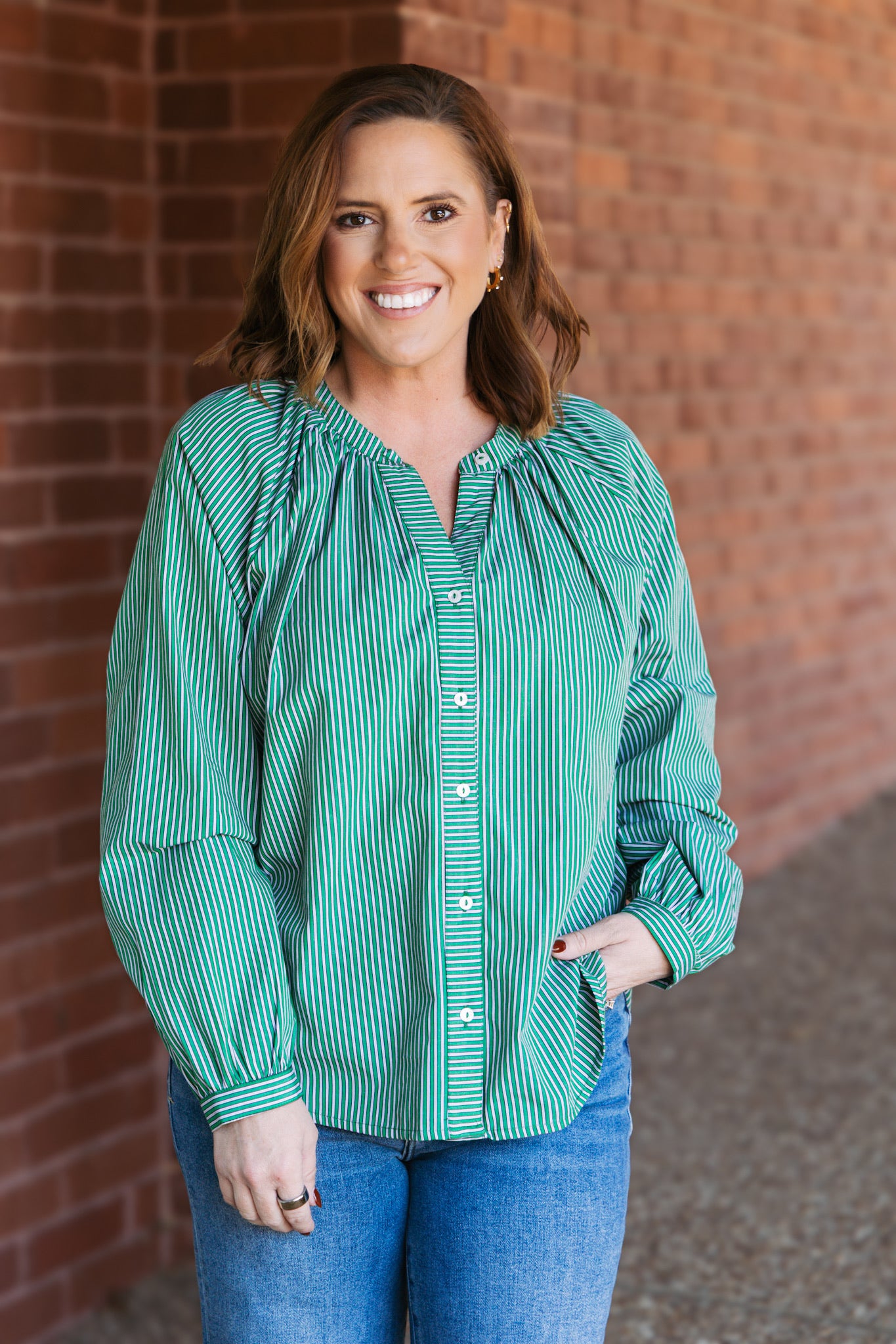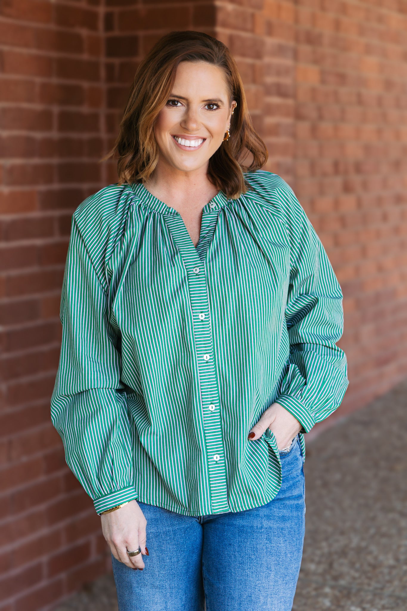 Woman wearing a green striped shirt and blue jeans against a white backgroundWoman wearing a green striped blouse and blue jeans against a white background